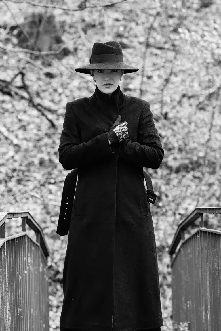 Timeless black and white portrait of a woman in a long dark coat and hat, standing on a bridge in nature.